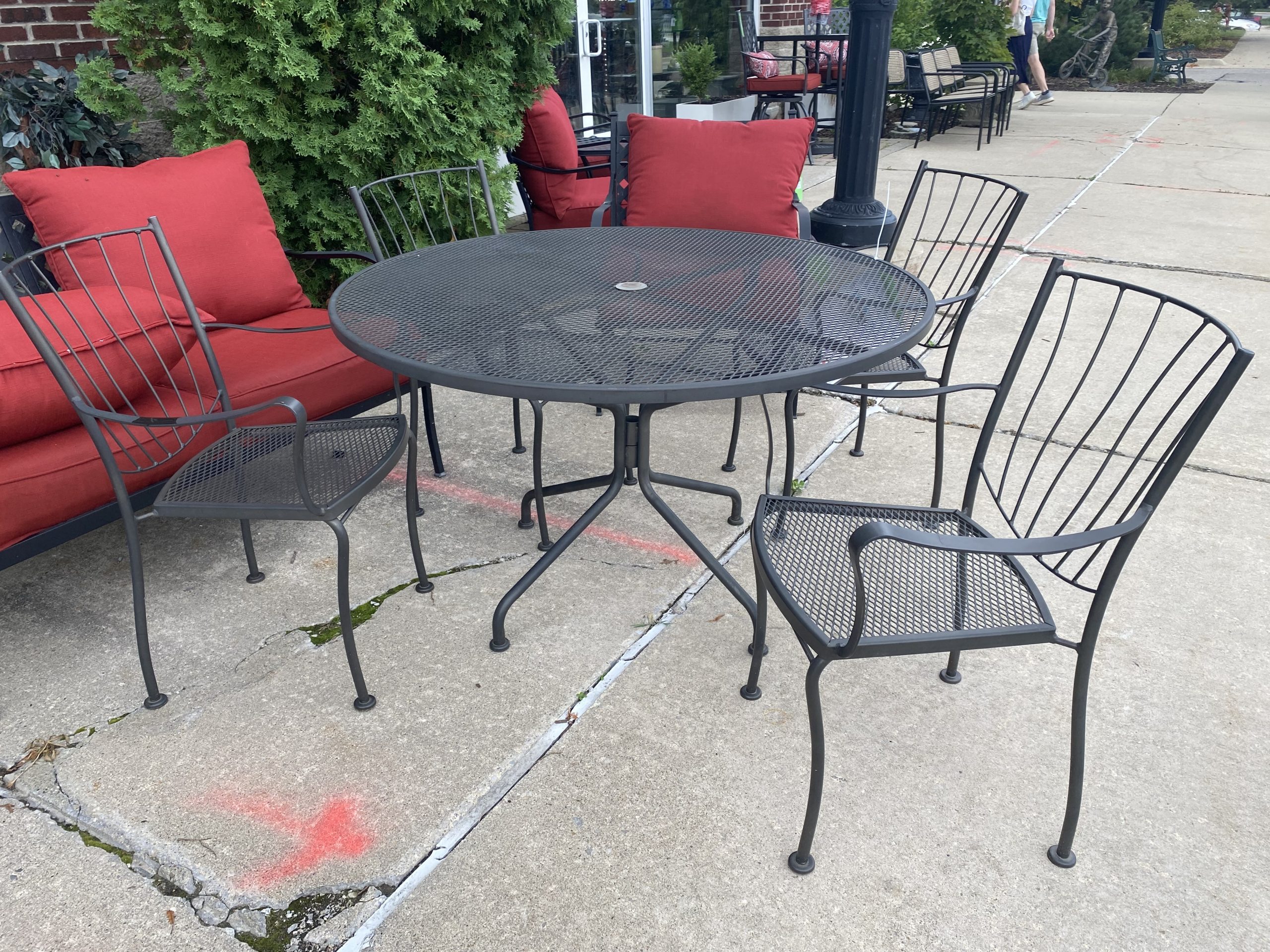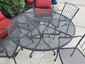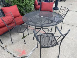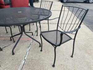5 Piece Russell Woodard Aurora Wrought Iron Dining Set Price $675.00 Size: 47.25in x 47.25in x 28.5in (LxWxH) Additional Pictures Product Location Location Ann Arbor Store Other related products: Vintage 5pc Woodard Florentine Collection Patio Set$950.00 Location: Ann Arbor Store Vintage Russell Woodard Daisy Bouquet Wrought Iron Outdoor Dining Table with 4 Vintage French Bistro Chairs$849.99 Location: Ann Arbor Store 2 ~ 34″ High Asian Martaban Jars with Spouts ~ Sold Separately!$360.00 Location: Ann Arbor Store 2 ~ 46″H Bronze Glazed Outdoor Temple Jars ~ Sold Separately!$499.99 Location: Ann Arbor Store 2 ~ Set of 2 Project 62 Boda Caned Patio Chairs ~ Sold Separately!$140.00 Location: Ann Arbor Store << back to the catalog