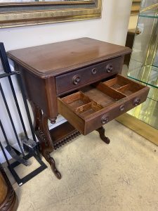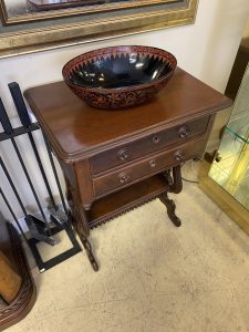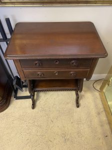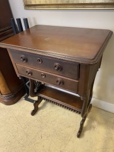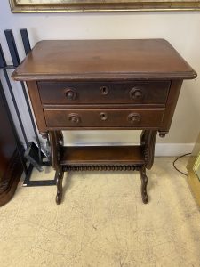 Antique Mahogany Spindle Harp Sewing Table Price $399.99 Size: 16in x 23in x 29.5in (LxWxH) Additional Pictures Product Location Location Ann Arbor Store Other related products: NEWER LazyBoy Electric Reclining Sofa$1,600.00 Location: Jackson Store Modern Black Lacquered Wood With Glass Top Sideboard-Console $500.00 Location: Jackson Store 1970’s James Mont Style Oxblood Horseshoe Chair$240.00 Location: Ann Arbor Store Handcrafted Primitive Twig Side Table$100.00 Location: Ann Arbor Store 3 ~ Lee Industries Custom Zikat Linen Swivel Acccent Chairs ~ Sold Separately!$350.00 Location: Ann Arbor Store << back to the catalog