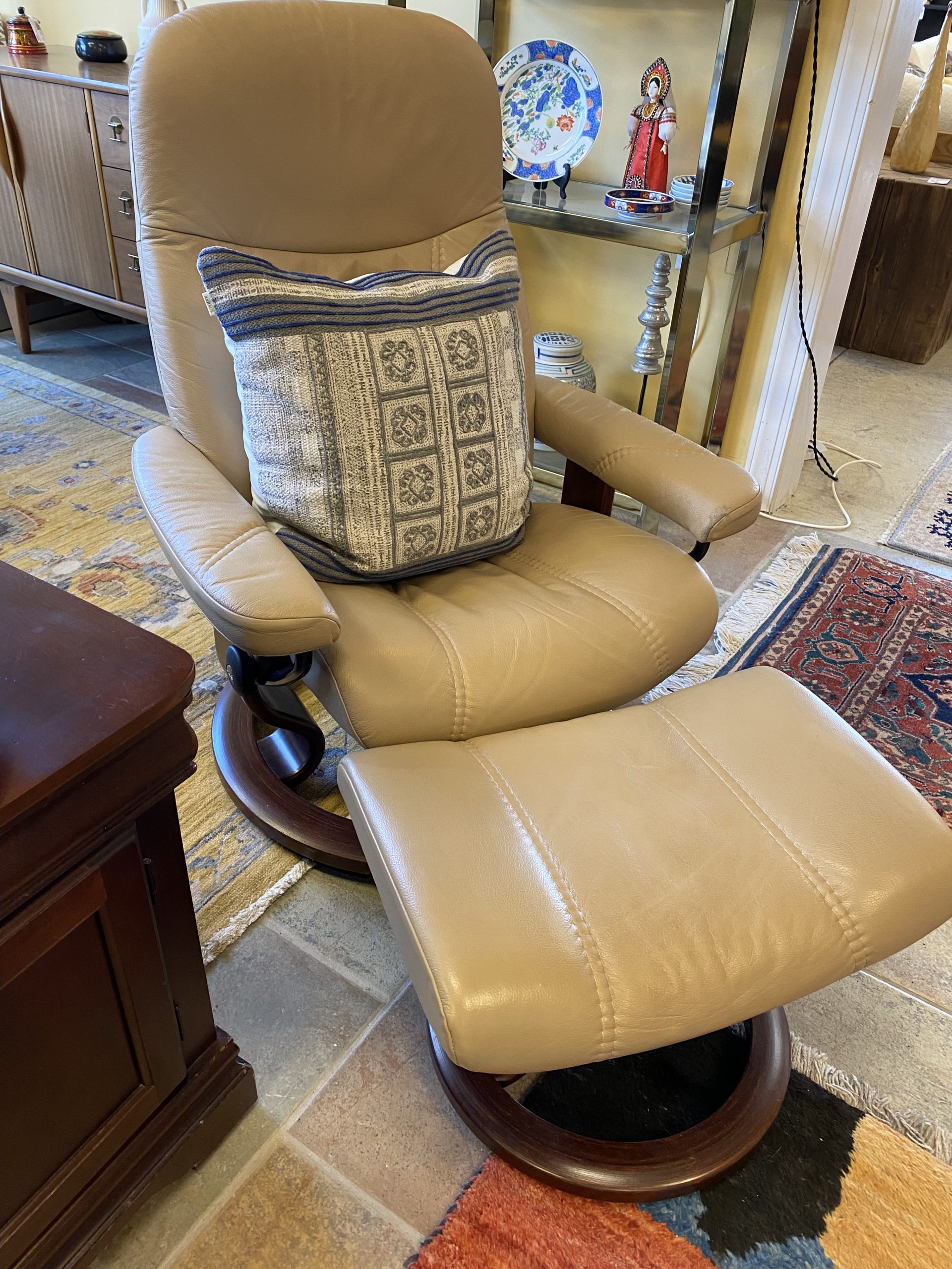 Ekornes Stressless CONSUL Sand Leather Swivel Recliner Chair & Ottoman Price $1,199.99 Size: 26in x 29.5in x 39in (LxWxH) Additional Pictures Product Location Location Ann Arbor Store Other related products: Mid Century Modern Ink & Ivy Rocket Side Table $270.00 Location: Jackson Store 2 ~ Set of 2 Design Within Reach Red Leather Chrome Cantilever Chairs ~ Sold Separately!$810.00 Location: Ann Arbor Store 4’9″ Vintage Elm Skinny Bench$270.00 Location: Ann Arbor Store Restoration Hardware Industrial Reclaimed Wood Bookshelf$199.99 Location: Ann Arbor Store Chrome & Glass Parsons Style End Table$150.00 Location: Ann Arbor Store << back to the catalog