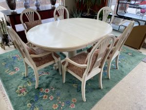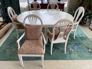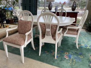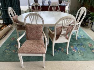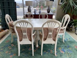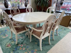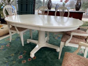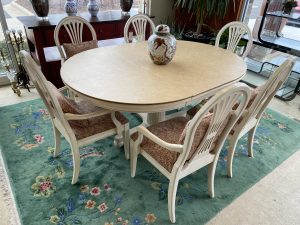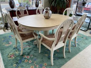 Ethan Allen Swedish Collection Pedestal Dining Table with 6 Chairs and One 18″ Leaf Price $1,099.99 Size: 66in x 48in x 30in (LxWxH) Additional Pictures Product Location Location Ann Arbor Store Other related products: Antique Mahogany Inlaid Drop Leaf Gate Leg Dining Table$399.99 Location: Ann Arbor Store Nichols & Stone High Top Pub Table & 4 Bar Stools$640.00 Location: Ann Arbor Store 4 Piece Amisco Kai Counter Height Pub Table Set $315.00 Location: Jackson Store Rare 10 Pc. Vintage Lancaster County By Willett Solid Maple Drop Leaf Table And Chairs $700.00 Location: Jackson Store Vintage St. Johns (Cadillac, MI) Solid Maple Hutch$250.00 Location: Jackson Store << back to the catalog