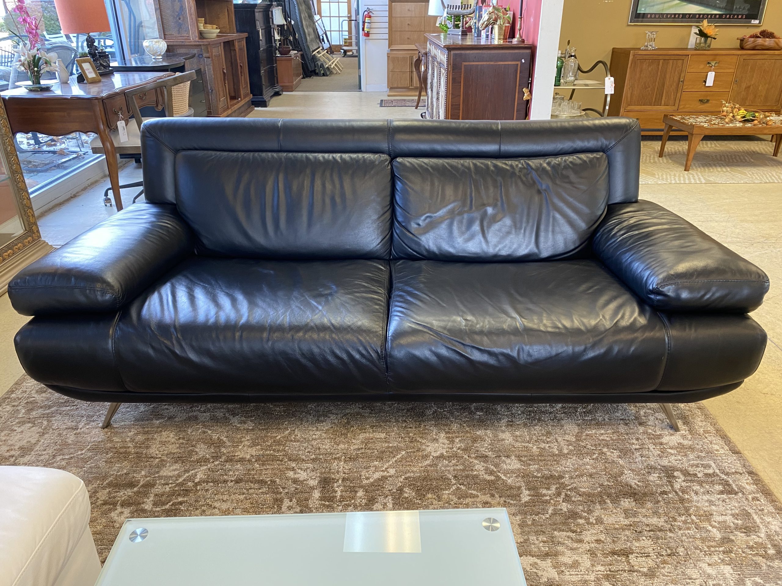 Natuzzi Editions Postmodern Black Leather Sofa Price $1,499.99 Size: 82in x 37in x 31in (LxWxH) Additional Pictures Product Location Location Ann Arbor Store Other related products: 2 ~ Wrought Studio Arnya Minimore Sofa ~ Sold Separately!$749.99 Location: Ann Arbor Store Carter (Chicago) Custom Contemporary Sofa$1,799.99 Location: Ann Arbor Store Mid Century Edward Wormley for Dunbar Bracket Back Sofa$2,240.00 Location: Ann Arbor Store Vintage Custom Harden Furniture Striped Silk Loveseat $200.00 Location: Jackson Store Custom Taylor King Furniture Loveseat $360.00 Location: Jackson Store << back to the catalog