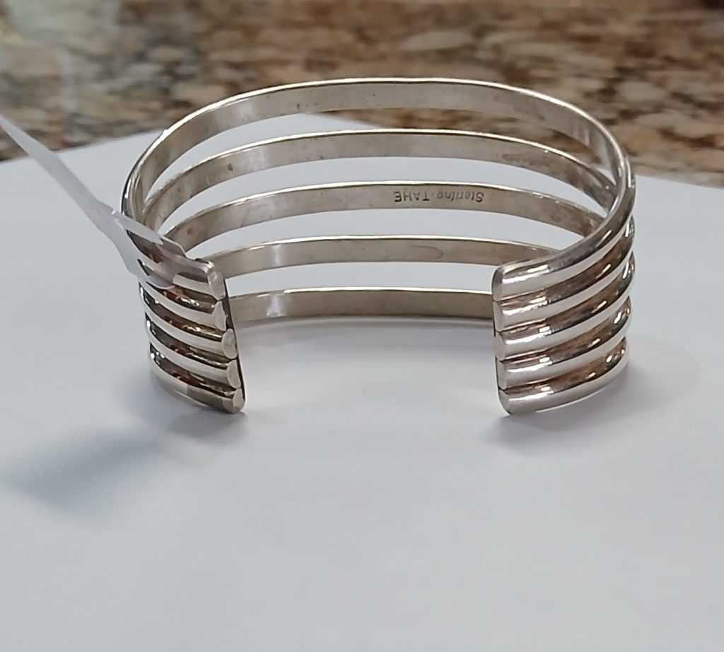 Silver 5 Banded Cuff Silver 5 Banded Cuff Price $275.00 Additional Pictures Product Location Location Jackson Store Other related products: Sterling Silver Navajo Signed Inlay-Coral-Onyx And Coral Cuff Bracelet$325.00 Location: Jackson Store Antique Victorian Hand Painted Forget Me Not Brooch $112.00 Location: Jackson Store Vintage Rare D & E Juliana Brooch And Clip Earring Set$125.00 Location: Jackson Store 1960’s Egyptian Revival Blue Scarab Filigree Necklace $50.00 Location: Jackson Store Vintage 900 Silver Agate Gemstone Cannetille Design Panel Link Bracelet$100.00 Location: Jackson Store << back to the catalog