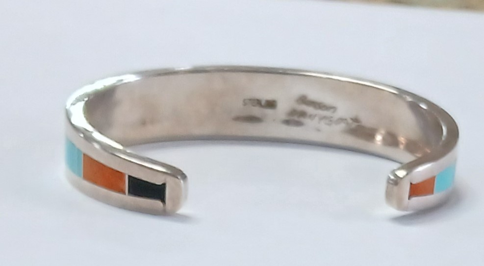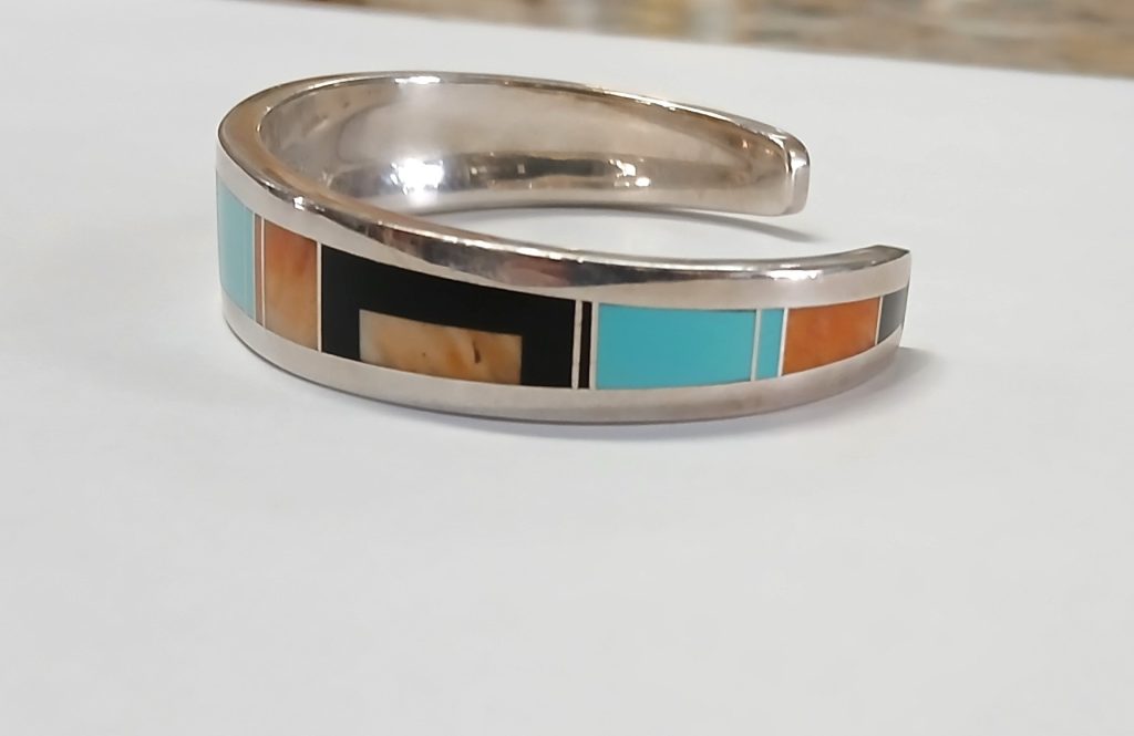 Sterling Silver Navajo Signed Inlay-Coral-Onyx And Coral Cuff Bracelet Sterling Silver Navajo Signed Inlay-Coral-Onyx And Coral Cuff Bracelet NON Tarnished. Price $325.00 Additional Pictures Product Location Location Jackson Store Other related products: Silver 5 Banded Cuff $275.00 Location: Jackson Store Vintage Rare D & E Juliana Brooch And Clip Earring Set$125.00 Location: Jackson Store Vintage Blue Lava Glass Necklace And Clip Earrings Set $110.00 Location: Jackson Store 1960’s Egyptian Revival Blue Scarab Filigree Necklace $50.00 Location: Jackson Store Vintage 900 Silver Agate Gemstone Cannetille Design Panel Link Bracelet$100.00 Location: Jackson Store << back to the catalog