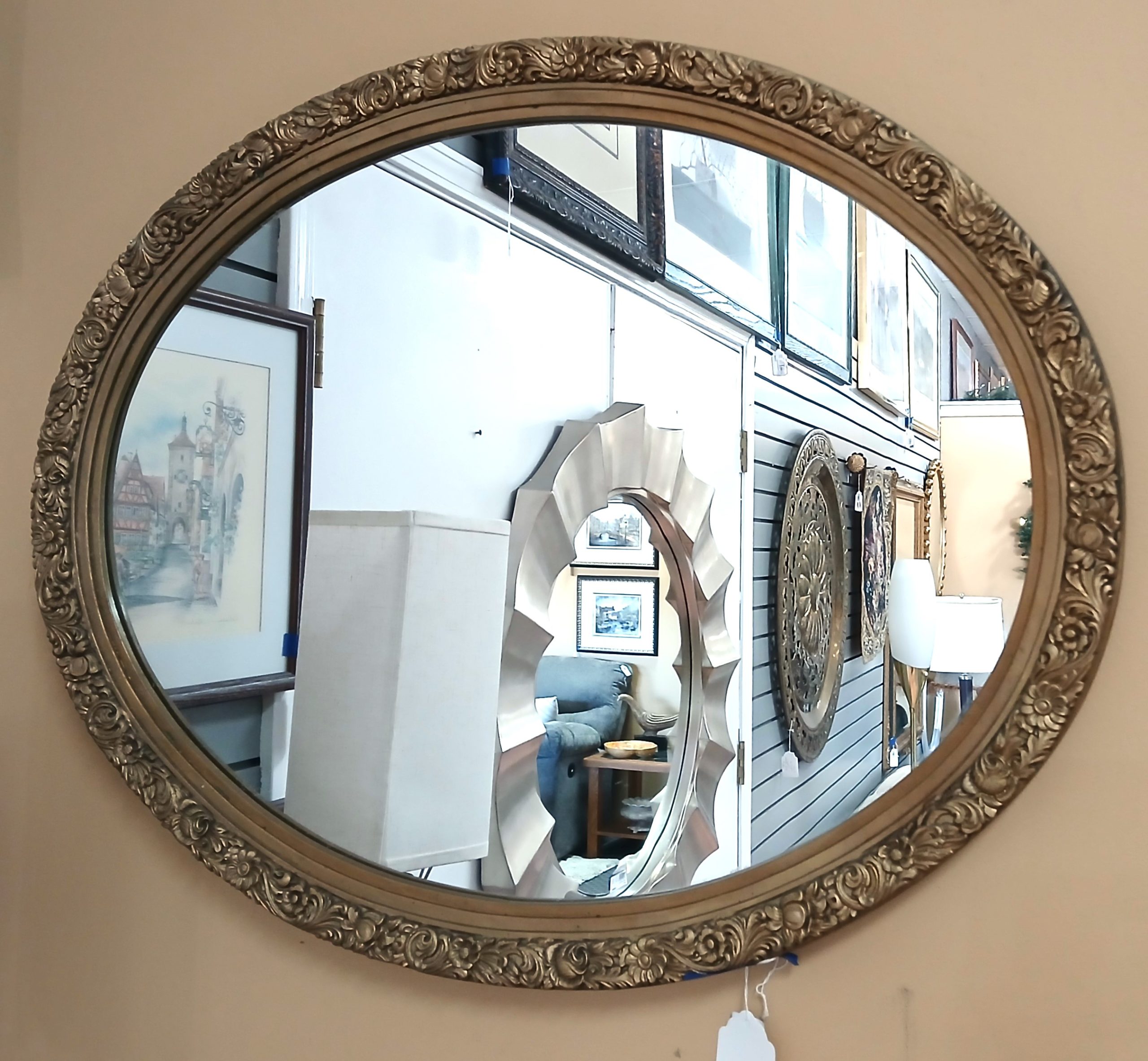 Vintage Oval Ornate Mirror Vintage Oval Ornate Mirror 24 x 30 Price $129.00 Product Location Location Jackson Store Other related products: Vintage Italy~ Bombay Two Way Beveled-Gilt Mirror $200.00 Location: Jackson Store Vintage Sold Oak Mirror $140.00 Location: Jackson Store Vintage 42″ x 30″ Windsor Arts Glided Mirror$199.99 Location: Ann Arbor Store Distressed Finish Iron Beveled Mirror$149.00 Location: Jackson Store NEW INOSEEN Rectangular Tempered Glass Mirror $50.00 Location: Jackson Store << back to the catalog