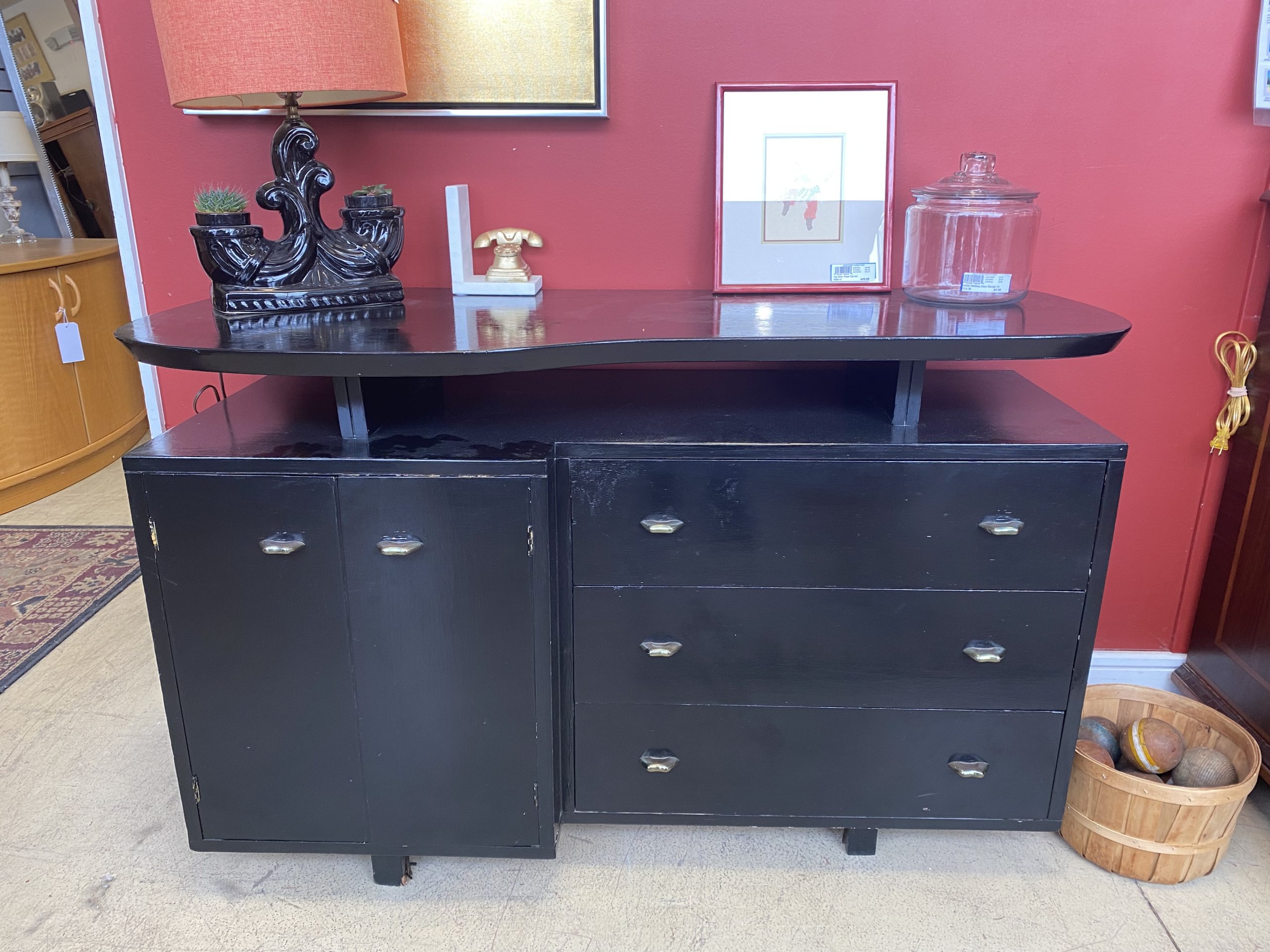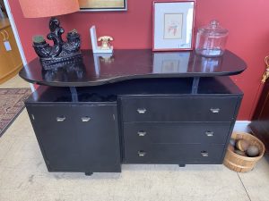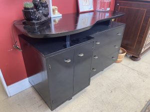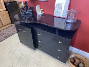 Vintage Repurposed Black Credenza/Sideboard with Elevated Top Price $149.99 Size: 51.5in x 21.5in x 32in (LxWxH) Additional Pictures Product Location Location Ann Arbor Store Other related products: 8′ Brunswick Cottage Grove Knotty Pine Pool Table w/ 5 Sticks and Rack$1,799.99 Location: Ann Arbor Store IPF International Furn. Occasional Chairs Sold Separate Monumental Redwood Live Edge Slab Side Table$900.00 Location: Ann Arbor Store NEW ! 2- Professional Custom Solid Oak Accent Tables Sold Separate Location: Jackson Store Chrome & Glass Parsons Style End Table$150.00 Location: Ann Arbor Store << back to the catalog