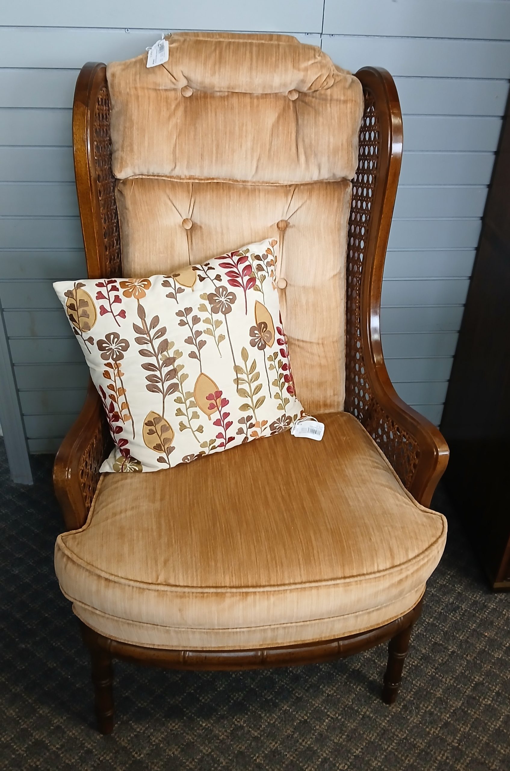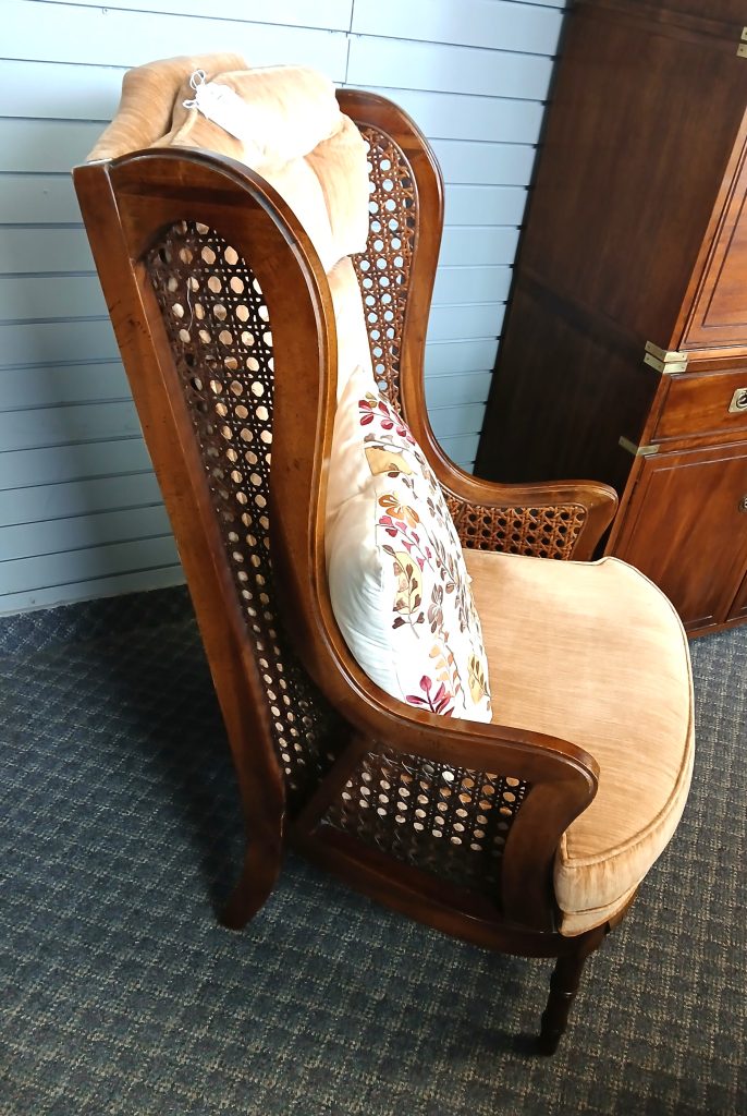 Homepage » Furniture » Vintage Thomasville Furn. Rattan/Wood Tufted Velvet Wing Back Chair